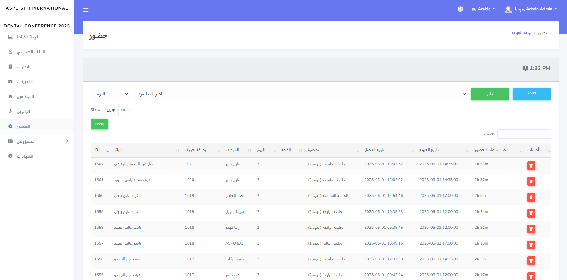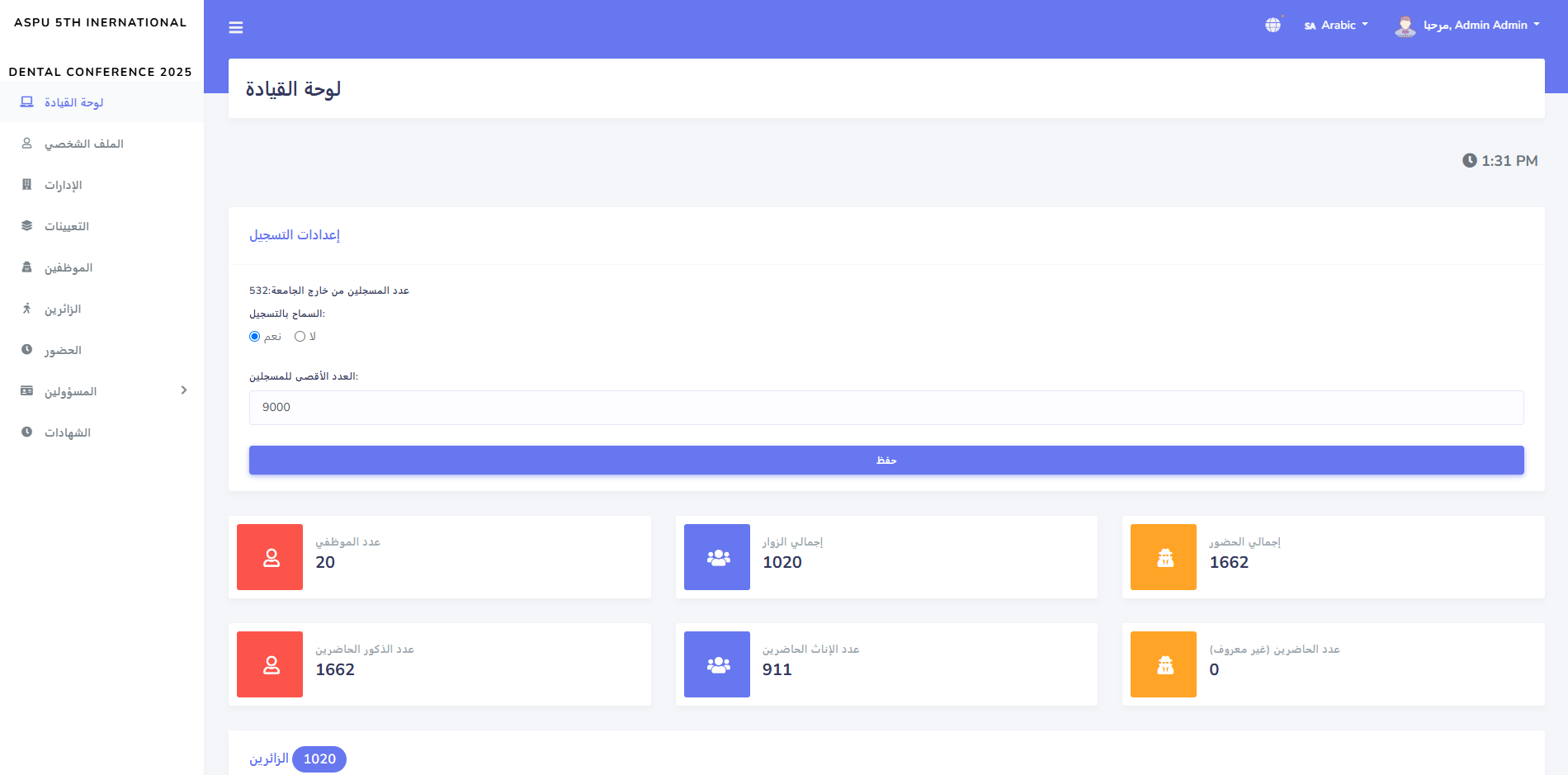 المؤتمر الدولي الخامس لطب الأسنان ASPU IDC 2025 أقيم في جامعة الشام الخاصة في سوريا، وضم أكثر من 1000 زائر من طلاب وخبراء وباحثين في مجال طب الأسنان. شمل النظام تسجيلًا إلكترونيًا، وتوليد بطاقة تعريفية عبر رمز QR، وتتبع الحضور بدقة (تسجيل دخول وخروج)، وتوليد شهادات إلكترونية.